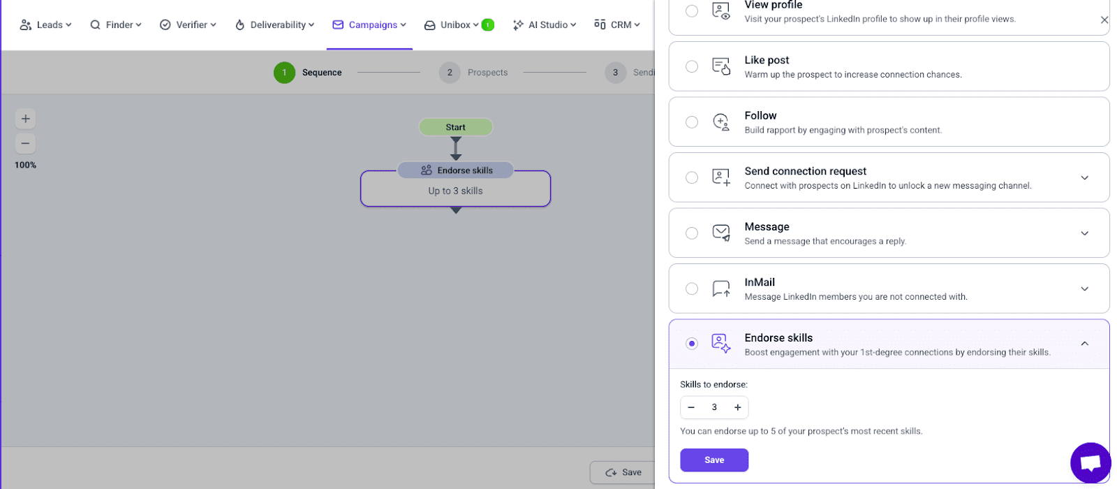 When creating a campaign, add a LinkedIn step and select Endorse skills from the LinkedIn actions menu on the right.