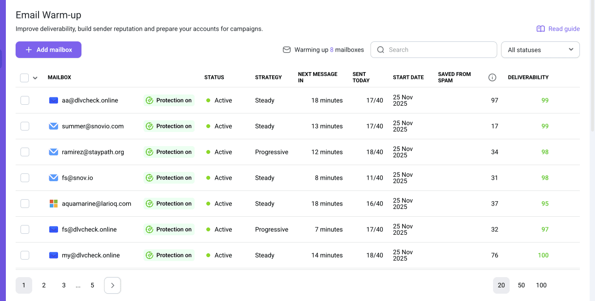 Email warm-up improves deliverability by sending emails and receiving replies through a trusted network of real inboxes—both other Snov.io users’ inboxes and our managed inboxes.