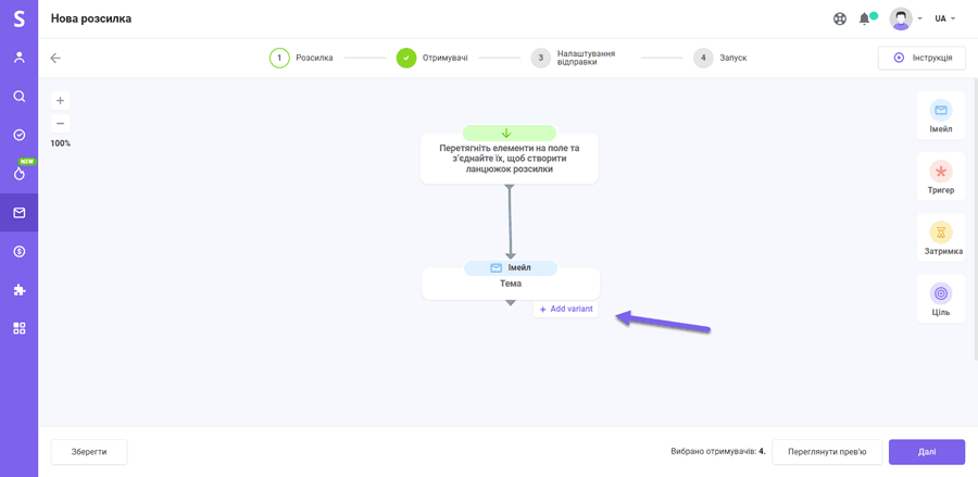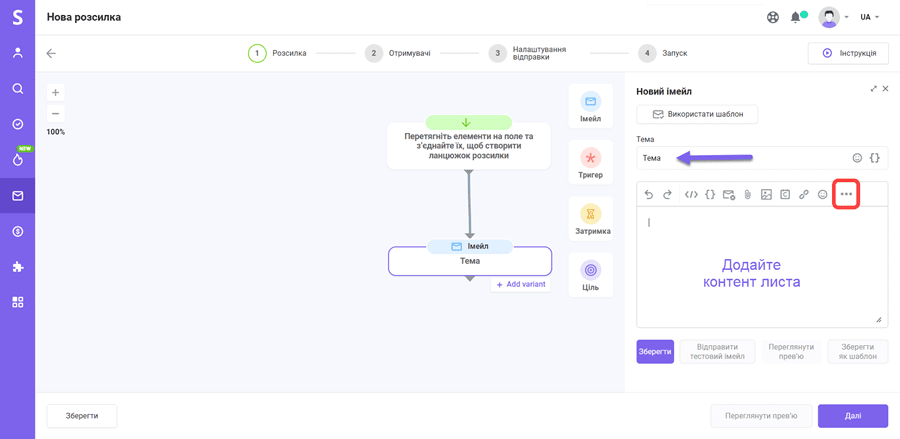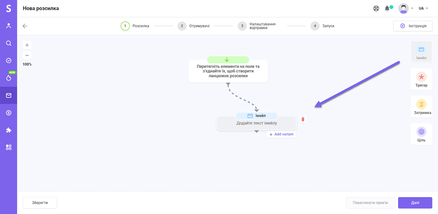 На кроці «Розсилка» в конструкторі знайдіть елемент «Емейл» в меню праворуч.