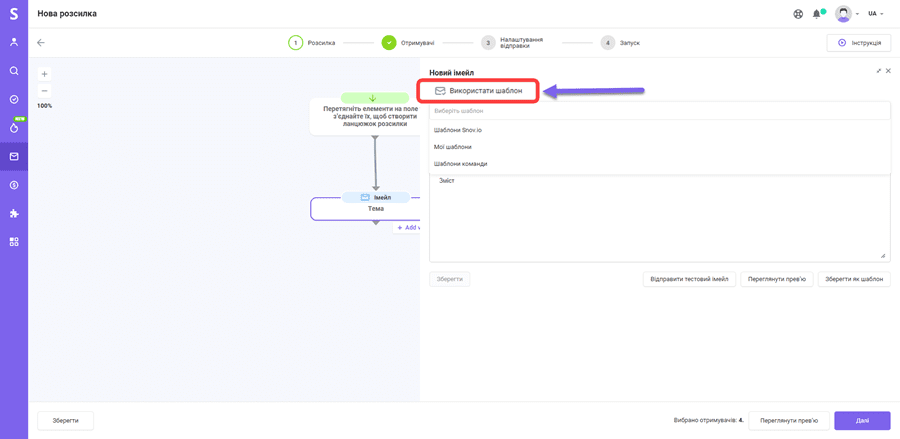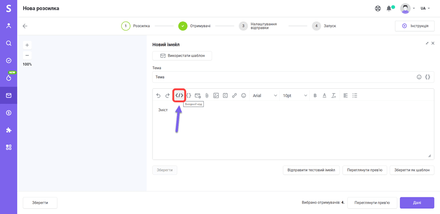 Якщо у вас є шаблон, створений у сторонній програмі для HTML-листів, ви можете розмістити код у редакторі емейлу в Snov.io.
