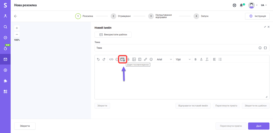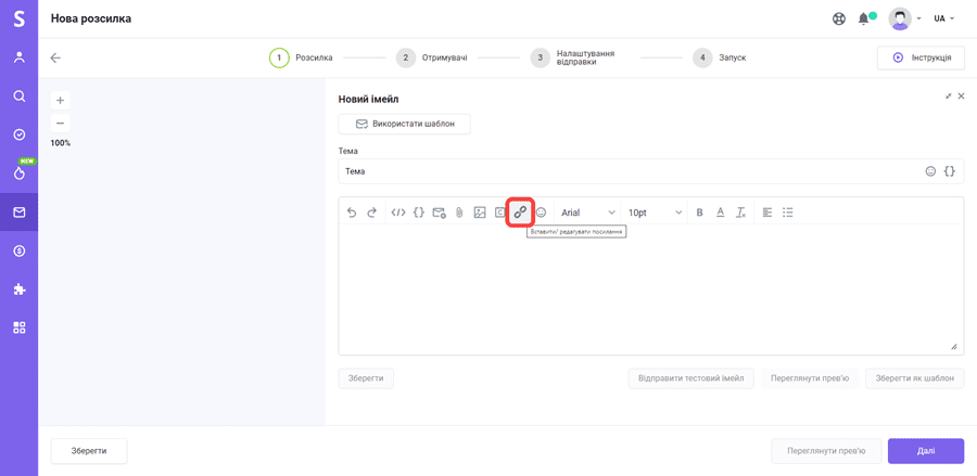 Якщо вставити посилання безпосередньо в редактор емейлу, воно не відстежуватиметься. Тому скористайтеся опцією «Вставити посилання» на панелі інструментів, щоб додати лінк.