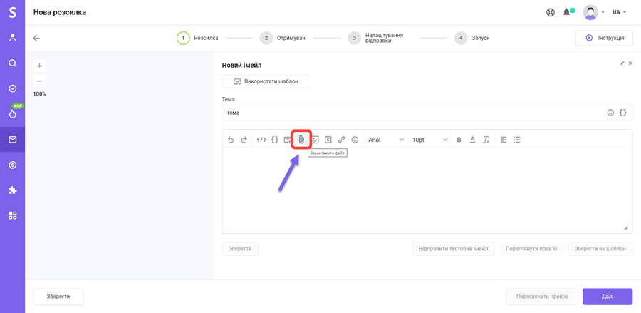 Натисніть значок «Завантажити файл» на панелі інструментів редактора емейлу.