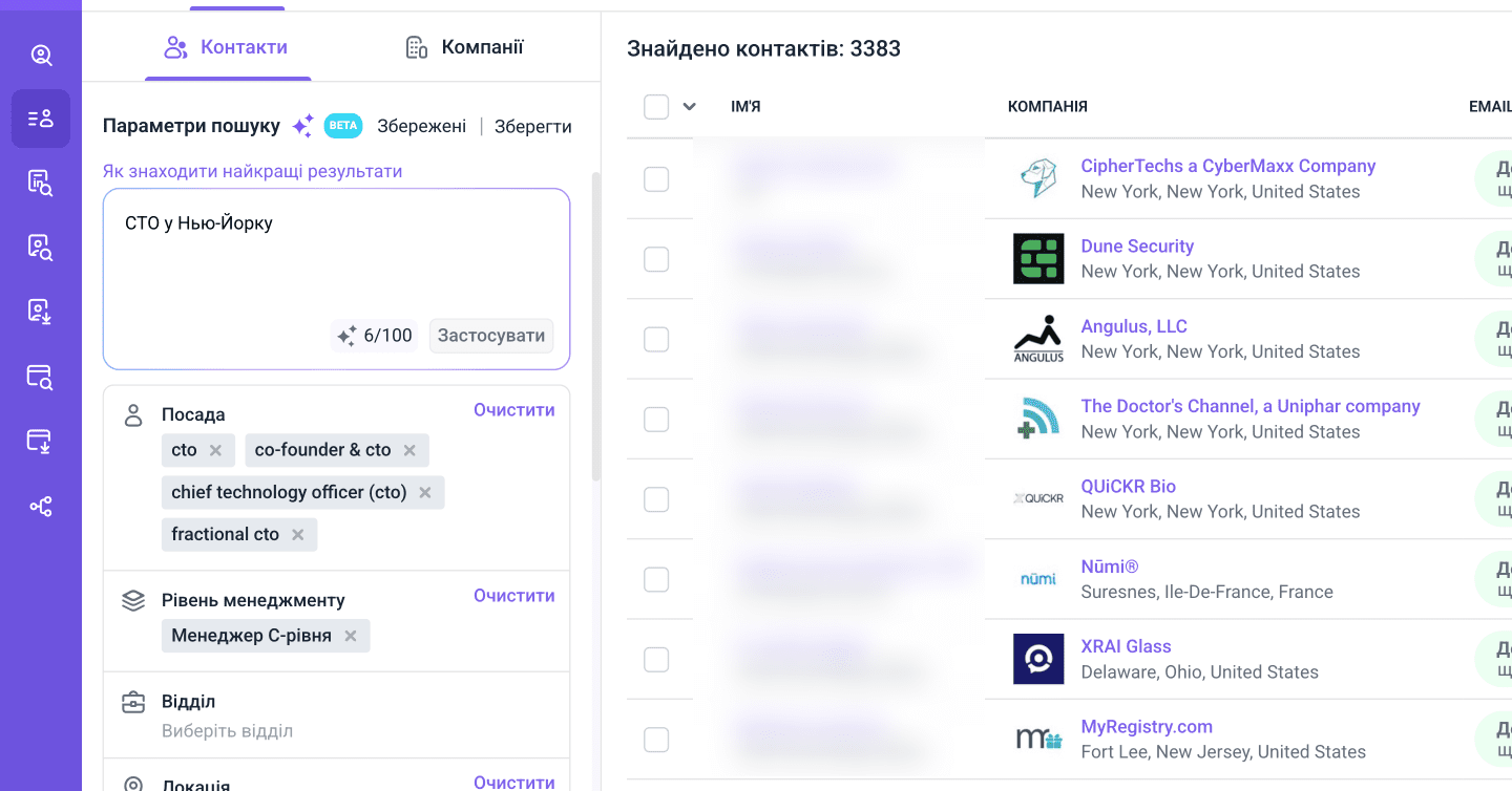 Шукайте C-рівень → ваш пошук міститиме топ-керівників, таких як CEO, CFO, COO, CTO.