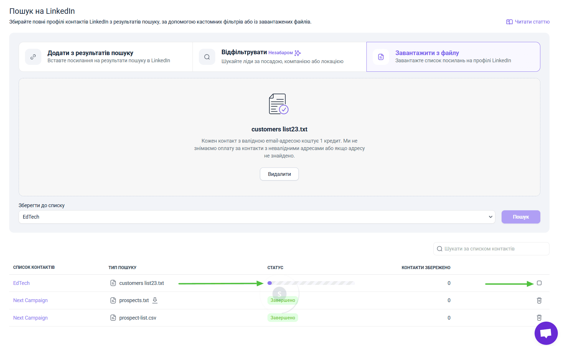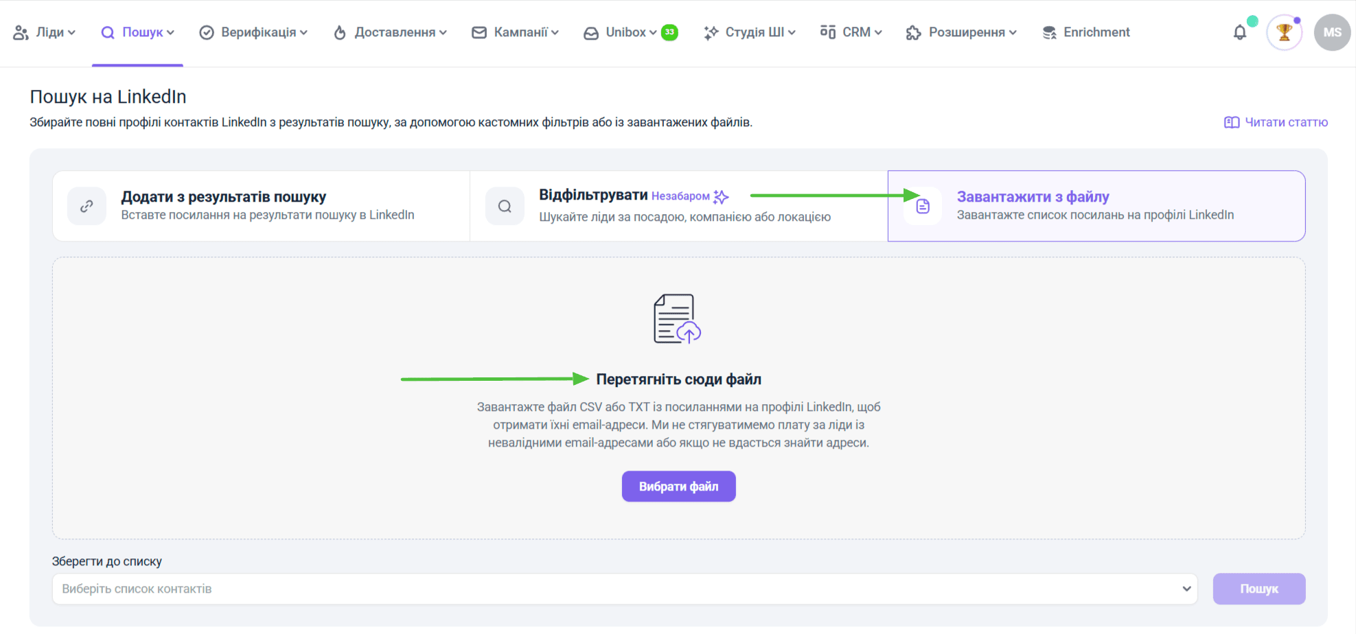 Функція завантаження файлу дозволяє здійснювати масовий пошук лідів.