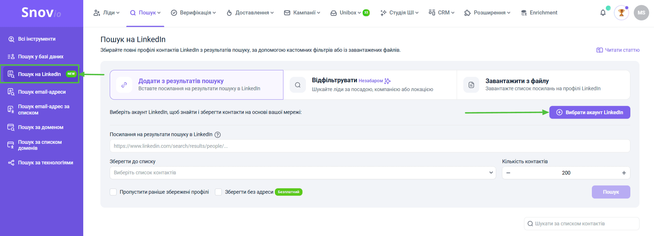 Пошук на LinkedIn доповнює наявні інструменти, надаючи просунуті опції для пошуку лідів у LinkedIn безпосередньо у вашому акаунті Snov.io.