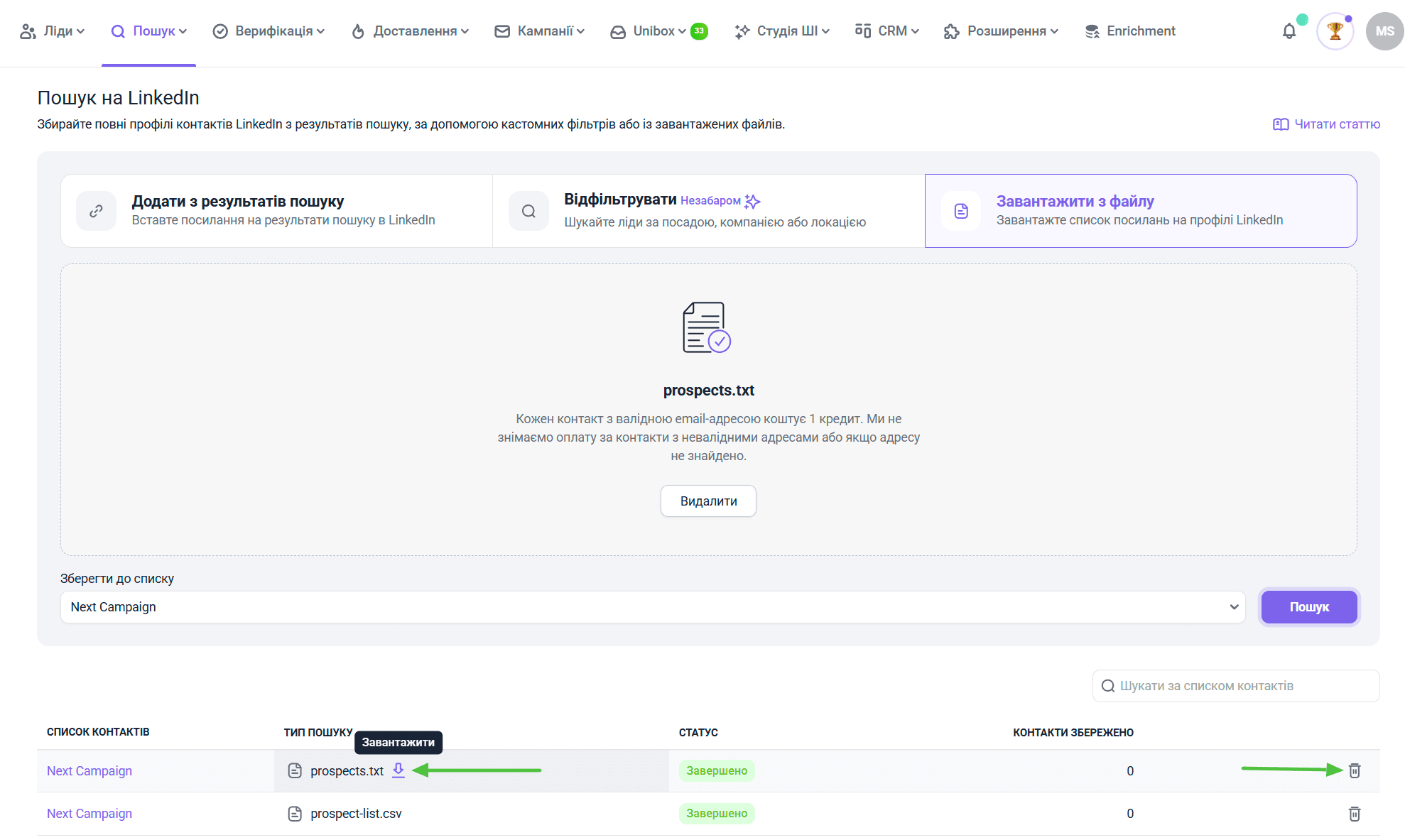 Опція видалення: Кнопка «Видалити» усуває цей імпорт з історії пошуку. Ваш поточний список потенційних клієнтів залишається в безпеці, зникає лише запис про імпорт.