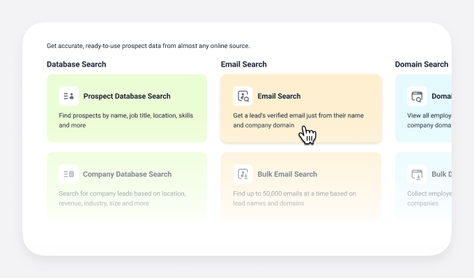 Our tools let you find leads by industry, location, job title, and more. Search leads your way—by company, domain, job title, industry, location, or bulk upload. Need instant lead discovery? Use our AI-powered lead finder with natural language queries. Our lead generation software adapts to your workflow, whether you're prospecting one lead or 100,000.